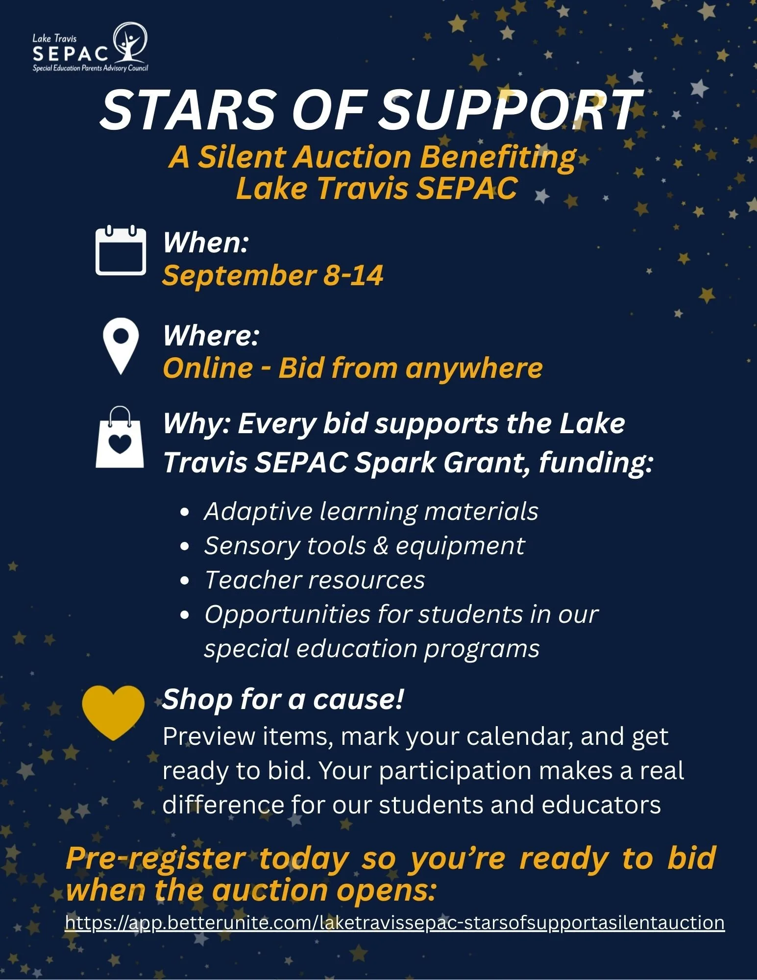 DONATE TO LAKE TRAVIS SEPAC DONATE NOW STARS OF SUPPORT SILENT AUCTIONBidding Starts September 8th, 2025 REGISTER AND BID HERE